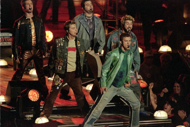 View of N'sync 28 Jan 2001: N'sync performs during halftime show of the Super Bowl XXXV Game between the New York Giants and the Baltimore Ravens at the Raymond James Stadium in Tampa, Florida. The Ravens defeated the Giants 34-7.Mandatory Credit: Jonathan Daniel /Allsport (Jonathan Daniel/Getty Images)
