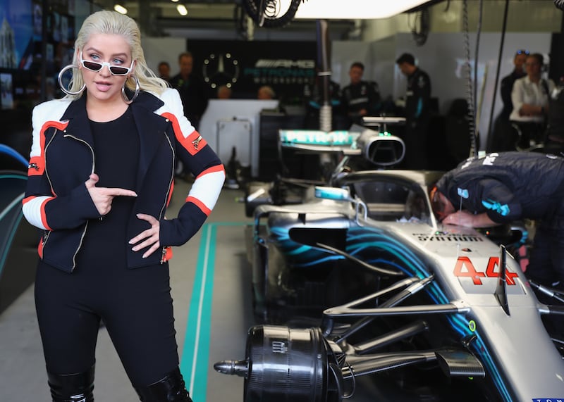 Azerbaijan F1 Grand Prix BAKU, AZERBAIJAN - APRIL 29: Popstar Christina Aguilera poses for a photo in the Mercedes garage before the Azerbaijan Formula One Grand Prix at Baku City Circuit on April 29, 2018 in Baku, Azerbaijan. (Photo by Mark Thompson/Getty Images) (Mark Thompson/Getty Images)
