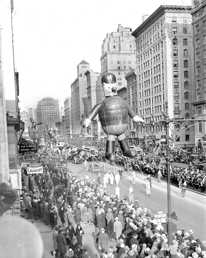 Balloon at Macy's Thanksgiving Day Parade The 'Early Bird' character balloon in the Macy's Thanksgiving Day Parade in New York City, 22nd November 1928. (Photo by George Rinhart/Corbis via Getty Images) (George Rinhart/Corbis via Getty Images)