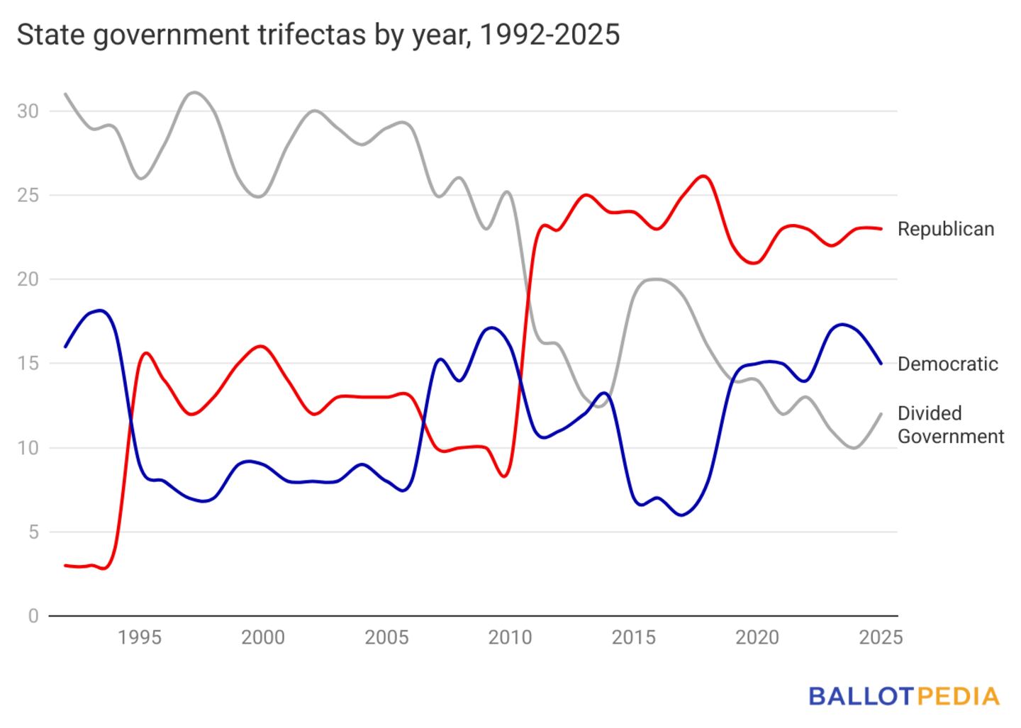 The chart above shows how nationwide trifecta numbers have changed between 1992 and 2025. Because newly elected officeholders are not sworn in until December of the election year or January of the following year, changes in trifecta status as a result of general elections are reflected in the following year's numbers.