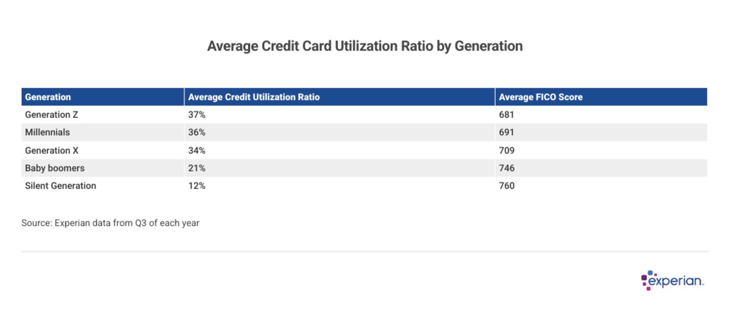Finally, consider each generation's demand for additional credit in the broader context of how much of their credit each one is using. On average, Gen Z, millennials and Gen X use more than 30% of their credit, while baby boomers and the Silent Generation use less than 30%. Reading across the groups, the strong relationship between average credit utilization and average FICO® Score becomes quite apparent.