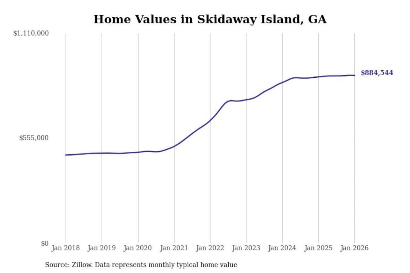 Stacker compiled a list of cities with the most expensive homes in Georgia using data from Zillow. Cities are ranked by the Zillow Home Values Index for all homes as of January 2026. The charts in this story were created automatically using Matplotlib.