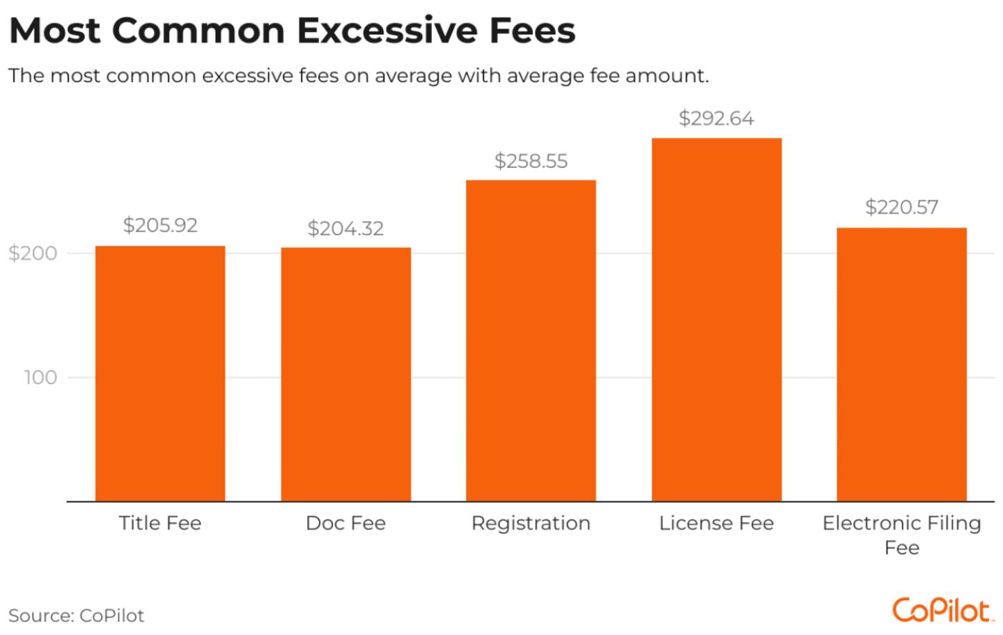 - The amount in license fees that dealers are allowed to charge is capped by the state and should not exceed a certain amount. This number is the average amount by which license fees exceeded the state limit in the used car purchases analyzed by CoPilot.