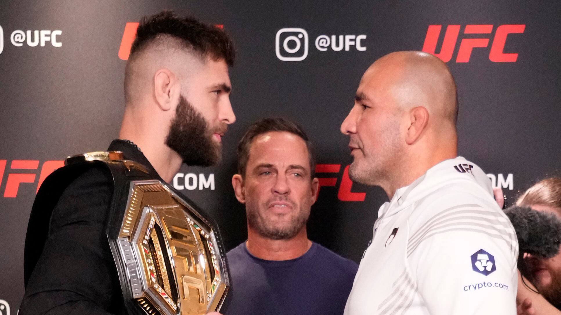 UFC 282 Media Day Face Off NEW YORK, NEW YORK - NOVEMBER 10: (L-R) Opponents Jiri Prochazka and Glover Teixeira face off during the UFC 282 media day at Marriott Marquis Hotel on November 10, 2022 in New York City. (Photo by Mike Roach/Zuffa LLC)