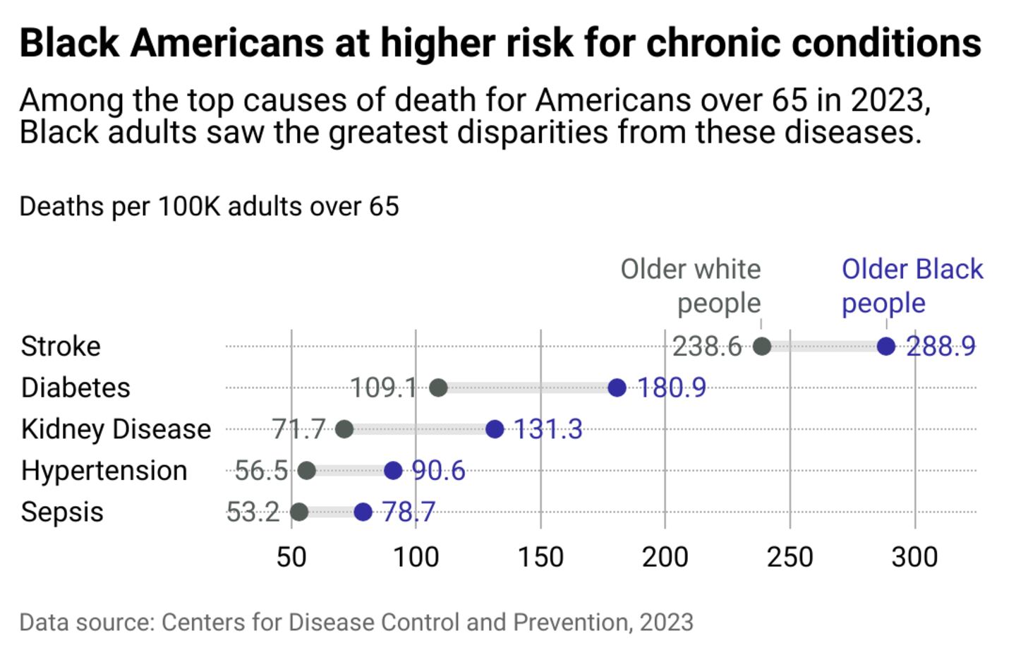For older Black people in America, the golden years often come with a harsh reality: They are more likely to suffer from chronic illnesses, be sicker in old age, and die younger than their white counterparts.