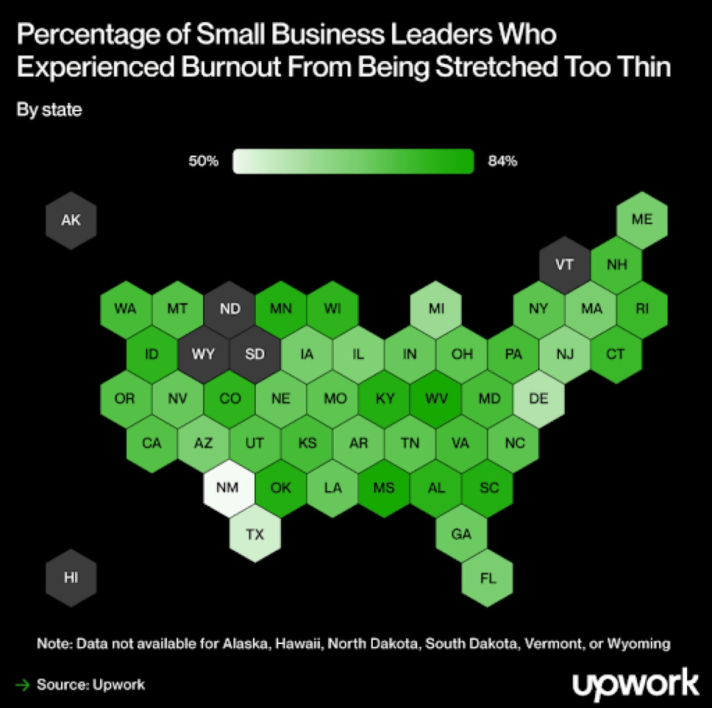 About 62% of SMB leaders in Georgia in Upwork's report said that tasks outside their core responsibilities take up time they could be spending on more strategic aspects of the business, and 56% believe that delegating more would help them achieve better results. Fully 63% knew just which tasks they would offload first if they could.
