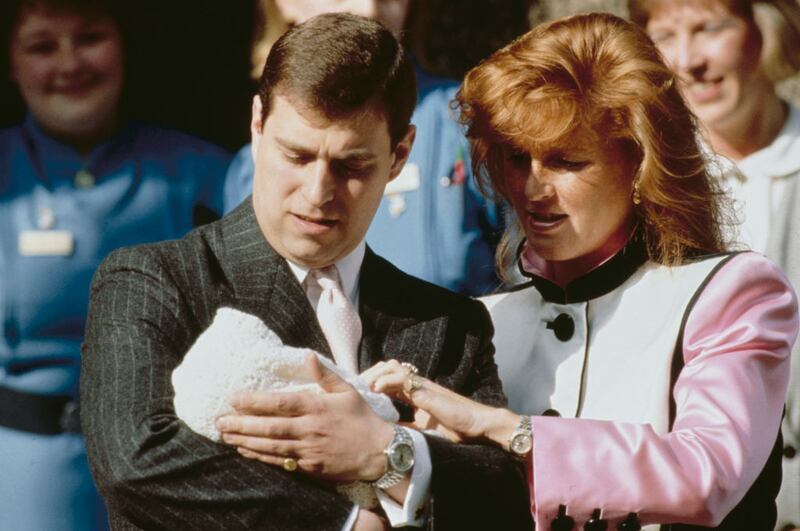 Sarah Ferguson: British Royals Prince Andrew, Duke of York and his wife Sarah, Duchess of York, leave the Portland Hospital with their daughter, Princess Eugenie, on Great Portland Street, London, on March 30, 1990. (Tim Graham/Tim Graham Photo Library via Get)