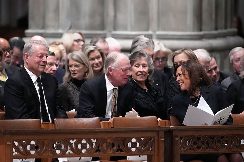 Bush and Biden and their wives sat in a row together, while former Vice Presidents Kamala Harris and Mike Pence chatted in their pew, with two other former Vice Presidents -- Al Gore and Dan Quayle -- sitting together behind them.