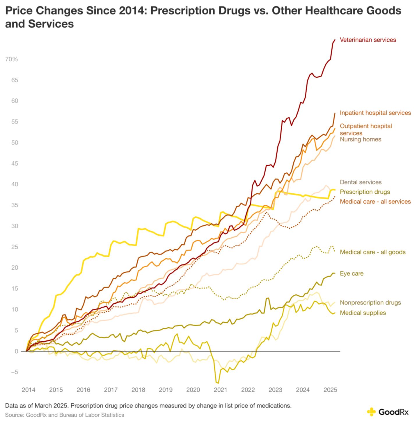 Today, however, drug price inflation is no longer the fastest mover. Housing, food, and even wages have now overtaken the pace of prescription drug inflation. But within the general category or medical goods, prescription medications remain among the most prone to inflation.